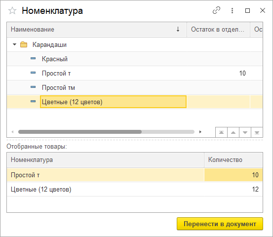 В дальнейшем в форме подбора пользователь должен иметь возможность выбрать произвольное количество номенклатурных позиций, которые в результате отображаются в дополнительной таблице «Отобранные товары», с указанием самого товара и его количества.