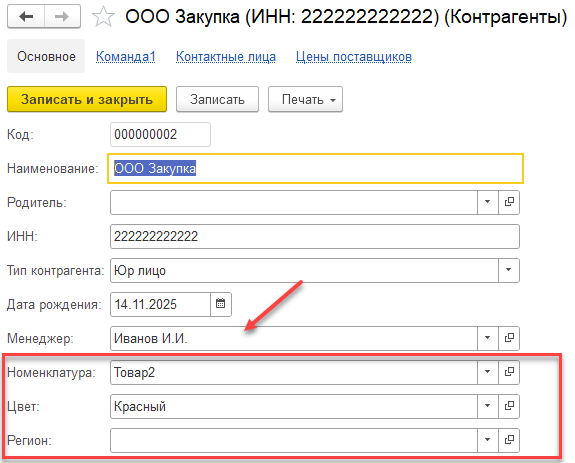 В основной форме контрагента необходимо иметь возможность вводить информацию о менеджере, который работает с данным контрагентом.
